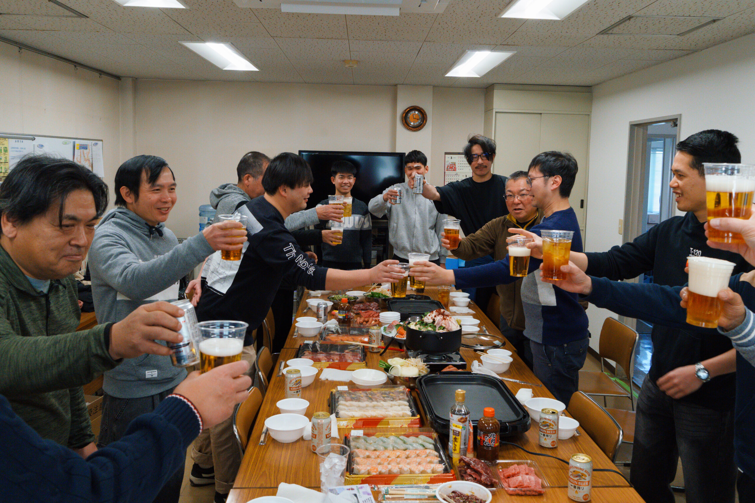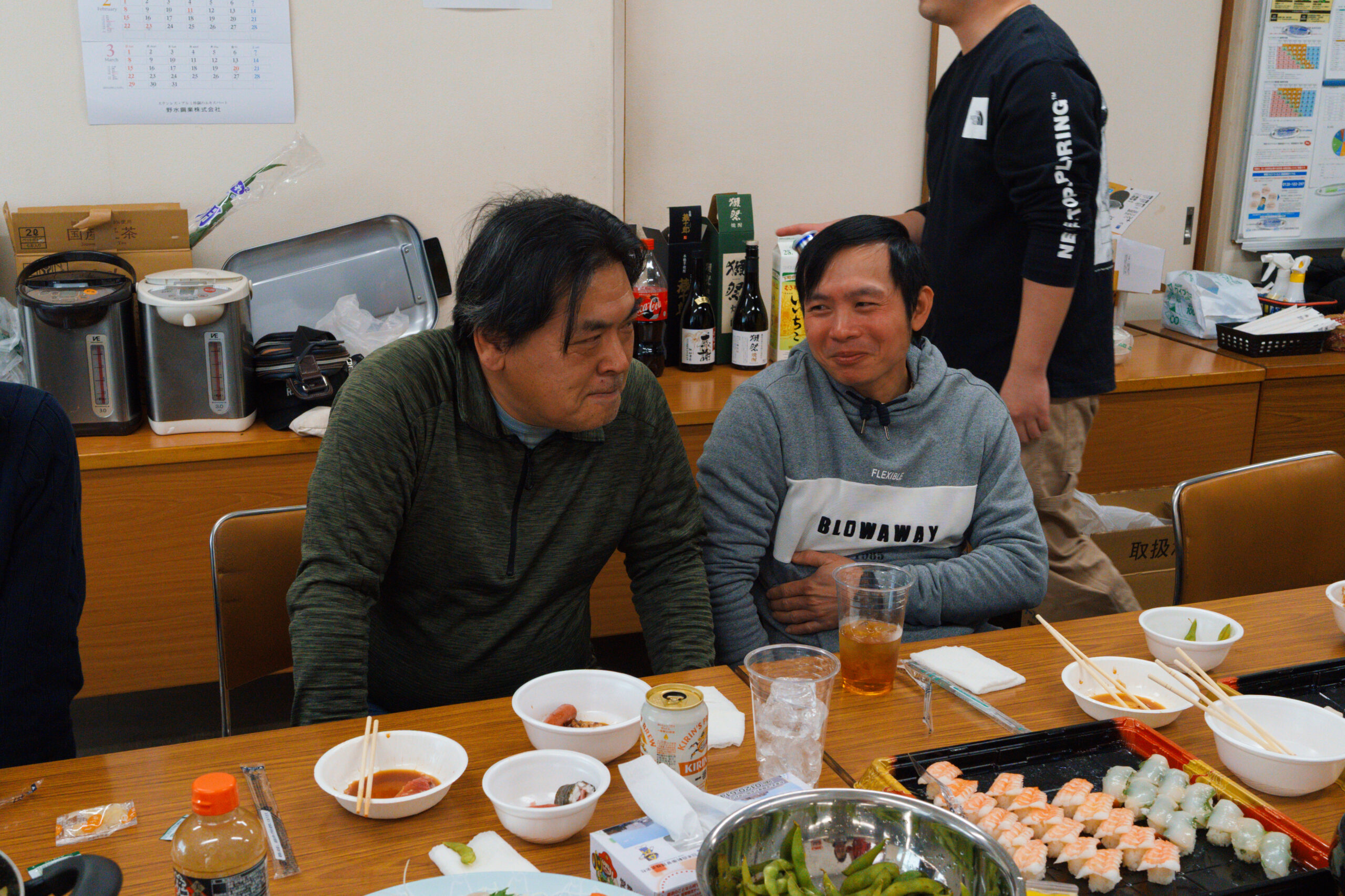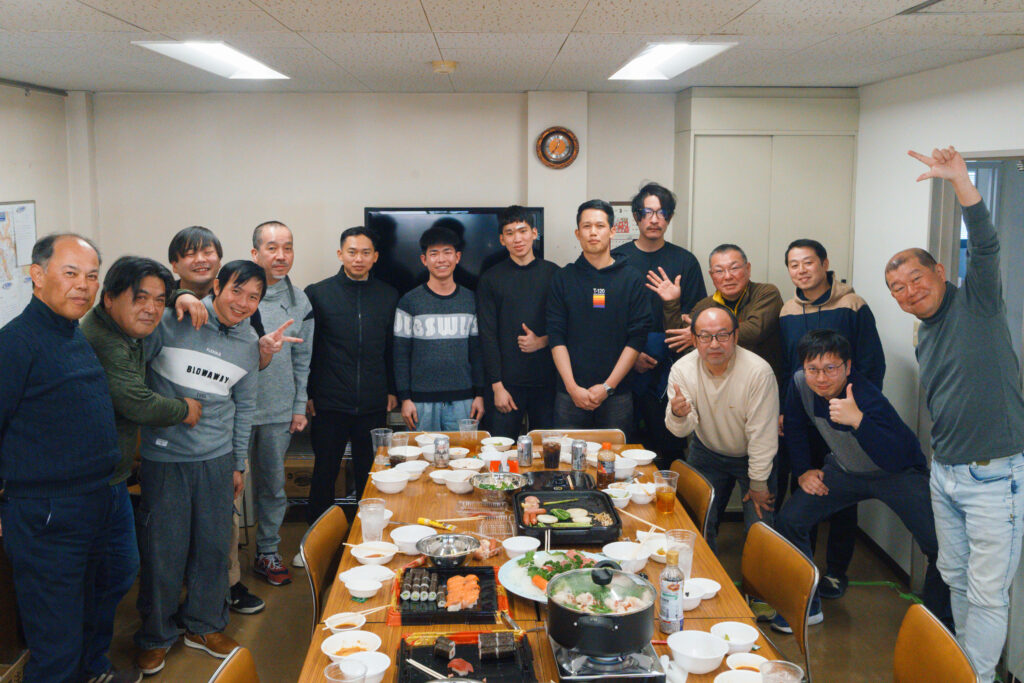 会の中では、部署や立場を越えた交流の様子も見られました。営業のメンバーが新しく入る実習生(新入社員)にお寿司を配っている場面もあり、自然に会話が生まれていたのが印象的でした。 こうした何気ないやり取りの中に、普段からのあたたかい関係性や、これから一緒に働いていく仲間として迎え入れる雰囲気が感じられ、とても良い時間になったと思います。