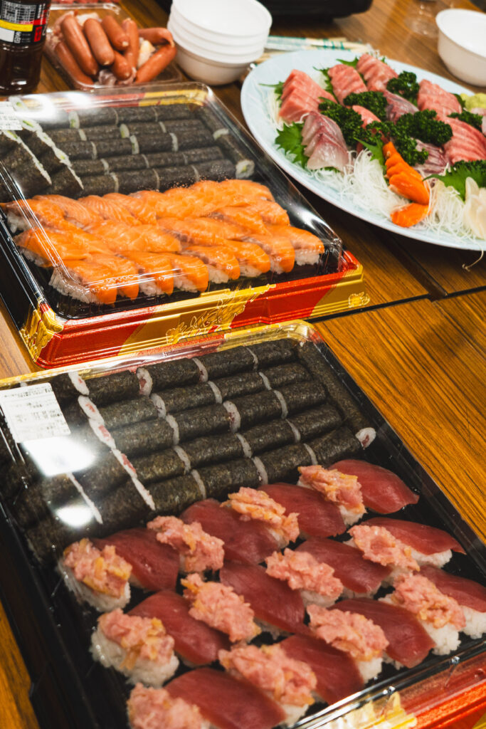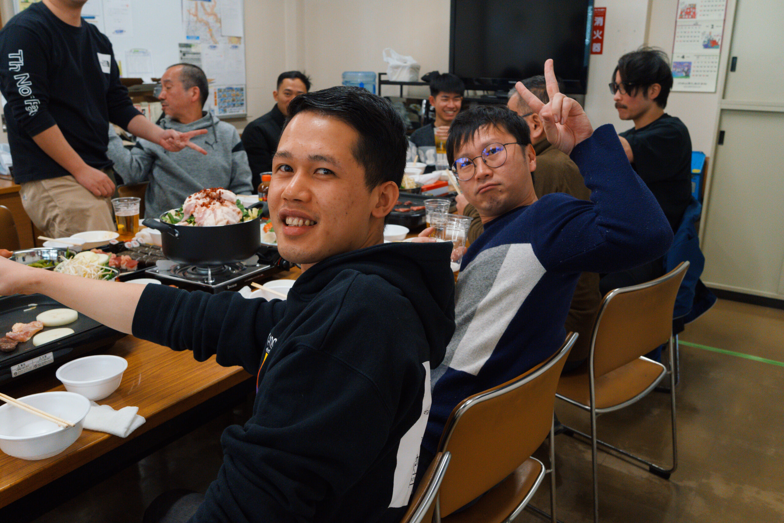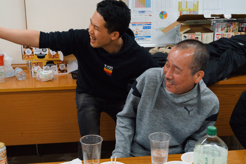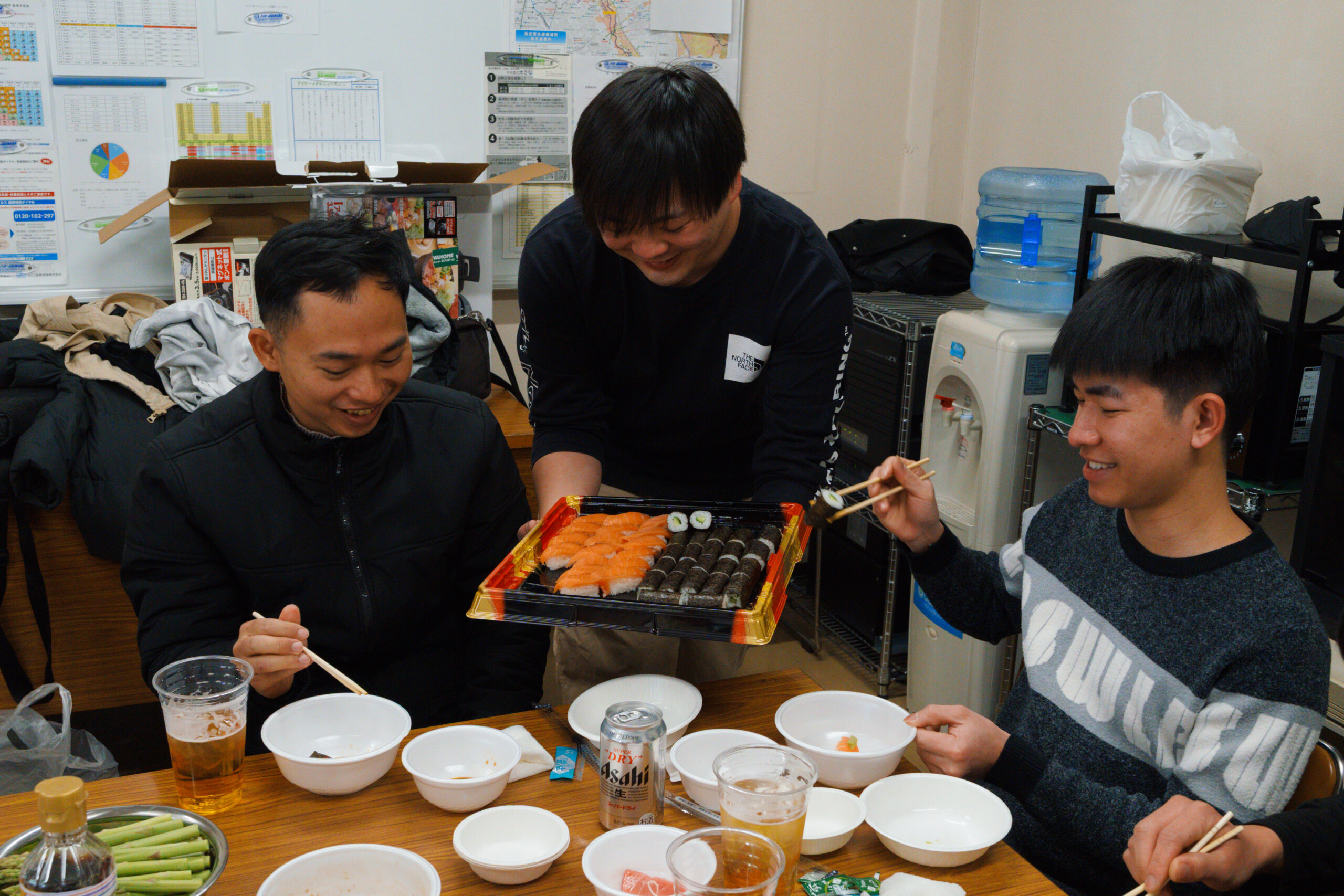 会の中では、部署や立場を越えた交流の様子も見られました。営業のメンバーが新しく入る実習生(新入社員)にお寿司を配っている場面もあり、自然に会話が生まれていたのが印象的でした。 こうした何気ないやり取りの中に、普段からのあたたかい関係性や、これから一緒に働いていく仲間として迎え入れる雰囲気が感じられ、とても良い時間になったと思います。