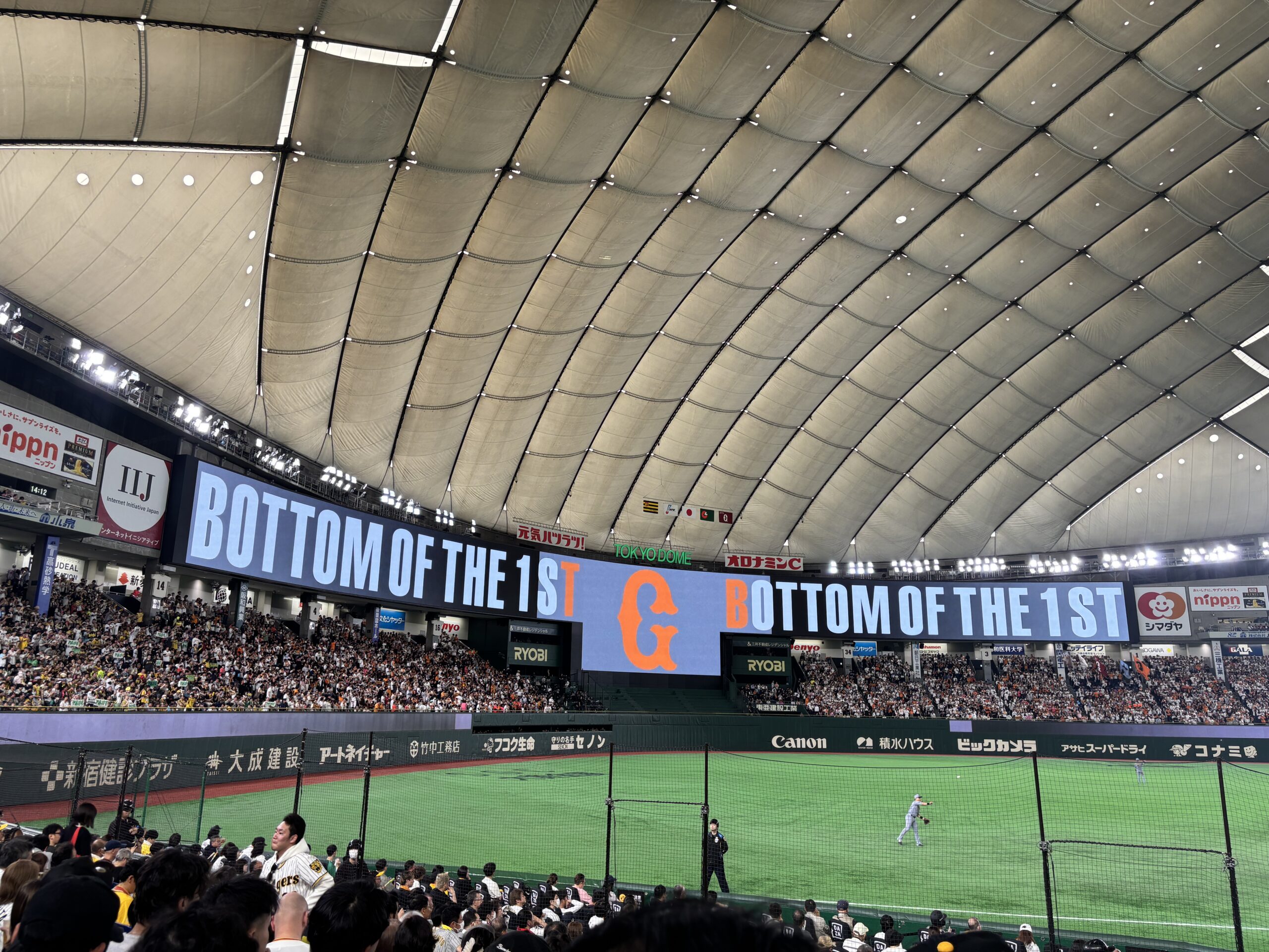 ホームの東京ドームでの観戦ですが、阪神戦になるとやはり阪神ファンが多く、周囲の雰囲気はいつも以上に熱く感じます。 体感では、3塁側の席は巨人ファン3に対して阪神ファン7くらいでしょうか(笑)。 阪神戦ならではの光景です。