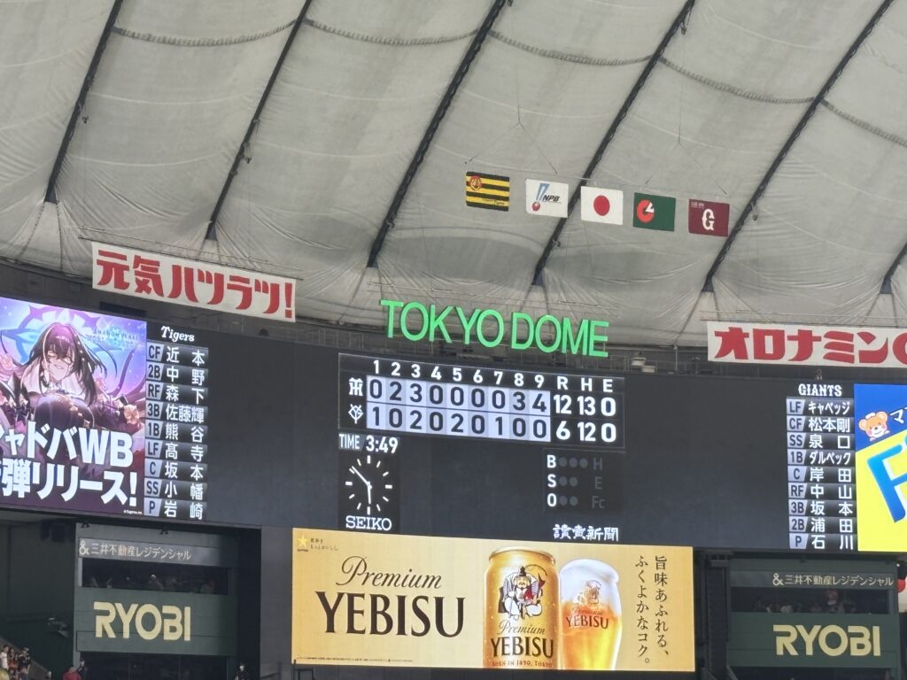 試合の結果は阪神が逆転勝利。 WBCにも出場した森下翔太選手、佐藤輝明選手らの活躍もあり、球場は完全に阪神ムードでした。 周りは総立ちで六甲おろし。敵ながら見事な盛り上がりでした。